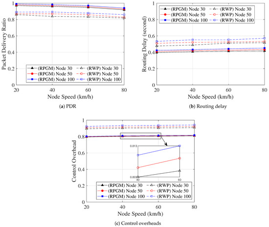Finally, we analyze how the number of nodes affects the network performance metric, as shown in Figure 18. In Figure 18a, we analyze the PDR as the function of node speed with various numbers of nodes in the proposed DLSR with DLC protocol. The PDR slightly decreases as the node speed increases. However, the PDR slightly increases as the number of nodes increases. This behavior can be attributed to the more predictable movement patterns in the RPGM model, leading to less frequent route changes and fewer packet losses. Furthermore, Figure 18b shows the routing delay as the function of node speed with various numbers of nodes in the proposed DLSR with DLC protocol. As the node speed and the number of nodes increase, a slight increase in routing delay can be observed, although not significantly. This can be attributed to the fact that with more nodes and higher speeds, the number of hops in the routing path increases, leading to a slightly longer routing process. Figure 18c shows the control overhead as a function of node speed with various numbers of nodes in the proposed DLSR with DLC protocol. It demonstrates that an increase in both node speed and the number of nodes leads to higher control overhead but not significantly. This observation can be explained by two possible reasons. First, with a higher number of nodes, the network density increases, causing a higher frequency of packet transmissions, thus, contributing to the increased control overhead. Second, the increase in node speed results in more frequent node mobility, which can lead to more frequent link breakages and route rediscoveries, further contributing to the increase in control overhead. Moreover, to address the control overhead issue, we consider a clustering protocol. The DLC protocol creates clusters with similar mobility patterns using cosine similarity and cosine distance metrics, effectively reducing the occurrence of frequent cluster head changes, especially at higher speeds. Despite these challenges, it is evident that the proposed DLSR+DLC protocol, paired with the RPGM mobility model, exhibits impressive scalability. It effectively enhances the PDR, reduces routing delay, and mitigates control overhead as the number of nodes increases.