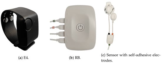 The wearable devices recording several physiological modalities during data acquisition of the PainMonit Database: (a) Empatica E4 (E4), (b) respiBAN Professional (RB), and (c) Electrodes used for the RB, i.e., Electromyogram.