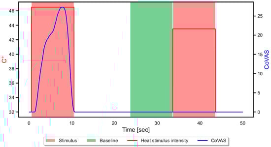 ML systems rely on training datasets of data samples and associated labels. Following Gouverneur et al. [24], the continuous data streams of the data acquisition were segmented by cutting out areas of 10 s during the stimulus as painful windows. Moreover, the 10 s prior to each segment were used as non-painful baseline windows (B). NP and – were applied as associated class labels during stimuli. In addition, CoVAS responses during the 2 s after the stimulus were also analyzed to capture late responses. Figure 2 illustrates the segmentation process, showing painful stimuli in red and non-painful baseline windows in green.