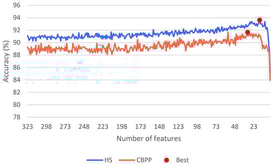 To find an optimal feature set for the task of automated pain classification, RFE was applied to the full feature space for the no pain vs. high pain task (as it is the most widely used one in the ML community). Figure 3 visualizes the results showing the classification performance in terms of accuracy for both datasets and the varying size of the feature space (x-axis). Each point of the graph represents a performance result given in accuracy for a LOSO CV. On the left side, the results of the original dataset can be found. Each subsequent point in the sequence resembles the performance result obtained by eliminating one feature from the existing feature space. Each test was performed five times to compensate for random variations in the performance of the RF models. Only the best result of each trial is presented here. The best performance of 93.62% with 15 features and 91.67% with 31 features could be achieved for the HS and CBPP datasets, respectively. In both optimal feature sets, most of the features are derived from the EDA signal collected at the finger site. While the model trained on healthy subjects focused on skin conductance characteristics derived from the RB, selecting only two respiration and 13 features from the EDA, the system selected a wider range of metrics from different sensors for the CBPPs. Here, three BVP, ten EDA (E4), 15 EDA (RB), one ECG and two EMG features were selected. The complete list of features is summarized in Table 5.
