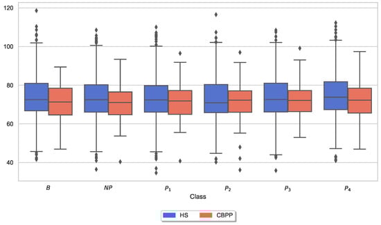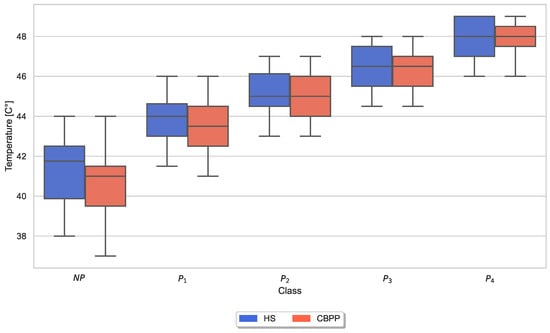 Moreover, box plots of the applied maximum thermode temperatures and maximum CoVAS ratings per dataset (HSs and CBPPs) and stimulus (NP to ) were generated to visually inspect variations in the calibration (and thus pain thresholds and pain tolerance thresholds) and the subjective pain ratings for the two groups. Figure 4 visualizes the applied thermode temperature for each individual stimulus separated by the two groups. Applied mean temperatures were slightly lower for NP and for CBPPs in comparison to the other group.