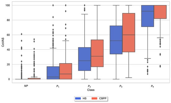 Furthermore, Figure 5 visualizes the maximum CoVAS rating during each individual stimulus separated by the two groups. The mean values of the CoVAS ratings were visibly slightly higher in CBPPs compared to the HSs dataset.
