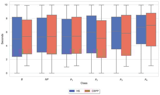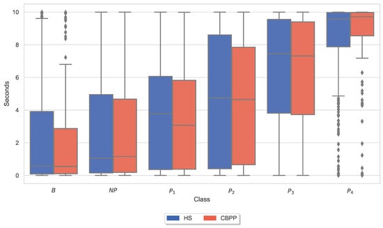 Box plots of the time when the maximum heart rate occurs computed by the Electrocardiogram (ECG) sensor per dataset and stimulus. There are non-painful (NP) and four painful (–) stimulus temperatures. Values have been individually evaluated for Healthy Subjects (HSs) and Chronic Back Pain Patients (CBPPs).