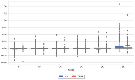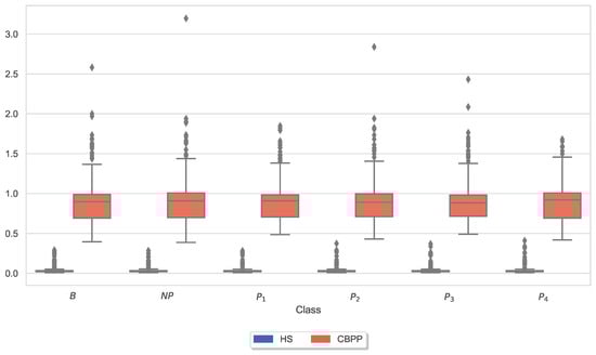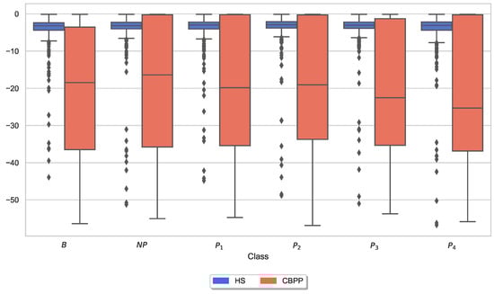 Exploratory analysis of maximum CoVAS values per stimulus (Figure 5) and applied stimulus temperatures revealed that CBPPs had slightly higher subjective pain intensity ratings in all stimulus levels and slightly lower temperatures for NP and stimuli (Figure 4), suggesting a lower initial pain threshold. Exploratory analyses of the features of the physiological responses that contribute the most to the classification outcomes (Figure 6, Figure 7, Figure 8, Figure 9, Figure 10 and Figure 11) show minimal differences between the two groups. A reduction in activity in the EDA signal in CBPPs could be introduced by the increased age of the group itself [50]. This slight reduction in EDA could also justify the reduced performance of the automated pain classification system on CBPPs in comparison to HSs. Here, a reduced overall activation yields less information to evaluate the subject’s level of pain. As previously shown [42], the EDA sensor presents simplistic characteristics for the automated recognition of pain. Basically, a rise in EDA is associated with pain, whereas a reduction or monotonic levels of skin conducted are related to non-painful segments. An overall minimized activation in the EDA signal could thus constitute the slightly lower performance of the EDA (RB) signal in chronic back pain patients compared to healthy subjects. Moreover, both box plots of the given EDA features show visible differences in the distribution for B and , showing their use for the classification task. Generally, EDA activation seems to be associated with painful segments, as an increase in tonic range is visible for the highest pain class (Figure 8). Moreover, maximum EDA peaks are found in higher pain classes (Figure 9), indicating that a rise of skin conductance with a late peak value is associated with pain, whereas a decreasing EDA signal (with a maximum value at the beginning of the time window) is associated with non-painful windows. Finally, differences in respiratory and EMG features between HSs and CBPPs show deeper respiration in CBPPs and more changes in the EMG signal compared to healthy probands. No exploratory differences were found between the groups for the BVP and ECG sensors.