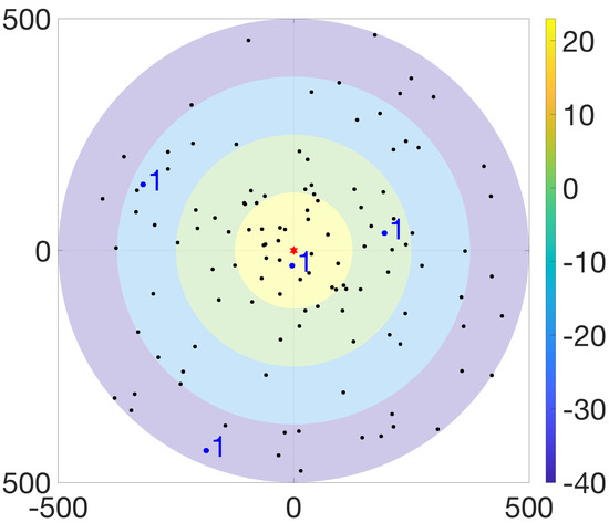 The BS and UEs operate in a single-input single-output (SISO) fashion, where the maximum transmission power of the BS is denoted by that is shared equally across all RBs. Moreover, the maximum and minimum transmission powers of UEs are represented by and , respectively. In the SGF-NOMA scheme, all UEs transmit at an identical power, denoted by . On the other hand, the MGF-NOMA divides the power control range into N levels and requires UEs placed at level to adjust its transmission power to . Figure 1 illustrates an aerial view of a network where the BS is located at the origin and serves 100 UEs over 25 RBs/clusters, each hosting 4 UEs. Although the rings represent four partitions, the ring colors indicate the transmission power of partitions such that UEs fall into yellow (level 1), green (level 2), blue (level 3), and purple (level 4) rings transmit at 23 dBm, 2 dBm, −19 dBm, and −40 dBm, respectively.