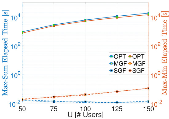 Let us start with the elapsed time comparison of the proposed MGF-NOMA and SGF-NOMA frameworks. Figure 3 shows that the proposed frameworks have similar elapsed time performance, which increases with maximum cluster size such that corresponds to . Although the Linear Sum Assignment takes around 10 ms to finish the entire clustering, Linear Bottleneck Assignment ramps up to 100 ms, which is mainly due to the fact that it calls Linear Sum Assignment and maximum cardinality bipartite matching as sub-procedures. On the other hand, the optimal benchmark takes half an hour to three hours to complete, where the main complexity is due to the cost matrix formation, each element of which is computed using CVX.