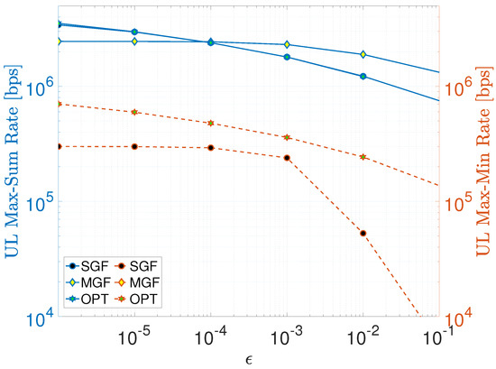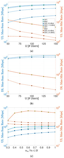 Finally, Figure 4c shows the impact of the probability of being active on max–sum and max–min rates. It is worth reminding that only the MGF-NOMA scheme requires the number of active UEs to determine the proper power levels for UE partitions. The MGF curve in Figure 4c shows the performance at various UE activity scenarios when power levels are set, assuming all UEs are active. Therefore, the MGF curve converges to the optimal benchmark as reaches unity. At this point, it is obvious that having a coarse estimate of U with accuracy can still turn into a desirable performance compared to the optimal benchmark.