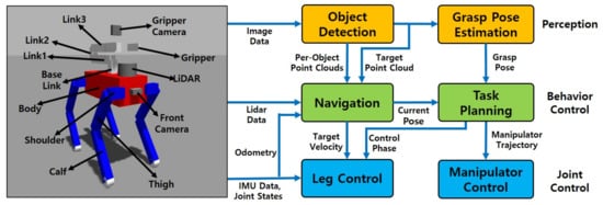 Lately, studies have been conducted on home service robots designed as mobile manipulators to create practical automated mobile manipulation systems for home environments [1,10,11,12]. However, these investigations only focus on wheeled-type robots equipped with manipulators. Several studies proposed frameworks to conduct grasping tasks with a manipulator mounted on quadruped robot [13,14]. However, many of these frameworks did not include comprehensive tasks combining perception, navigation, locomotion, and manipulation.