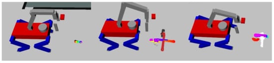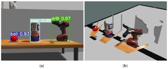 The experimental evaluation was conducted using Gazebo [30], an open-source 3D robotic simulator integrated within the ROS framework [28]. However, we found a slipping problem when grasping an object with the gripper, so we adopted gazebo_grasp_plugin to solve it. The experimental setup, as illustrated in Figure 17, closely emulated the configuration resembling the Robocup@Home 2021-virtual league environment. As is customary in the competition, shown in Figure 18, this experiment encompassed object classification tasks. The system’s speed and accuracy were assessed by placing objects in predefined positions. To run the simulation and YOLOv7 simultaneously, we used the desktop equipped with an AMD Ryzen 7 5800X, 32 GB of RAM, and an NVIDIA GeForce RTX 3090.