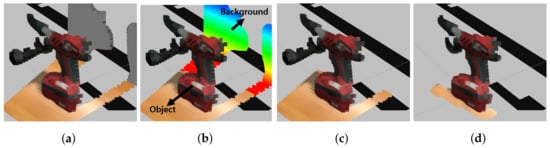 Figure 4a reveals the presence of outliers causing distortions. To address this issue, we deploy two machine learning techniques: KNN [17] and RANSAC [18]. Initially, showcased in Figure 4b, we partition the point cloud into object and background segments using KNN [17]. However, distinguishing between the object and background through KNN [17] alone is challenging. To address this, considering the closer proximity of the object’s centroid to the robot’s camera, we exclude the background by eliminating the portion with a more distant centroid. This strategy yields a model devoid of background, showcased in Figure 4c. Subsequently, by leveraging plane-fitting RANSAC [18], the remaining outliers are filtered, aiding in the acquisition of plane normal vectors utilized for predicting grasp directions. The culmination of these steps yields refined 3D models free from outliers, as depicted in Figure 4d.