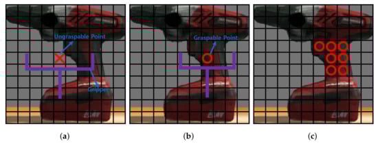 The primary step in the prediction process involves the selection of grasp candidates extracted from the height map. As illustrated in Figure 7, this procedure requires transforming the gripper to fit the height map and subsequently evaluating each element in conjunction with the gripper configuration to ascertain its graspability. A point is considered a graspable candidate when the height of the coordinate situated at the center of the gripper exceeds the height of the locations where the gripper’s tips are positioned by a predefined margin. However, within this evaluation, if the slopes present within the gripper’s region exhibit a gradient lower than a specified threshold, the coordinate is classified as ungraspable. Comprehensive details of this operational phase are presented in Algorithm 2.