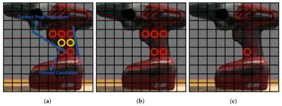 Following determining the contact pose inclinations, depicted in Figure 8, a subsequent filtering process is implemented to address candidates within low inclination regions. From the remaining candidates, the one closest to the center of the height map is selected as the prime candidate. In cases where multiple candidates share the same distance to the center, the selection prioritizes the candidate within the narrowest area.