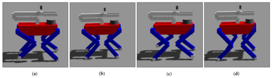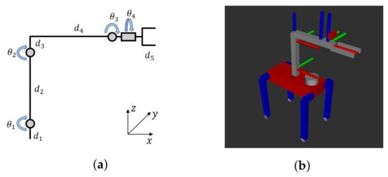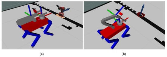 To ensure minimal impact on the robot’s gaiting, the manipulator integrated onto the quadruped robot is designed to be lightweight. Achieving this objective involves employing a low-DOF manipulator, effectively reducing the weight of its actuators. As depicted in Figure 14, a four-DOF manipulator configuration has been adopted for object grasping. Utilizing these parameters, we can define as a translational transform and , , and as rotational transforms around the x, y, and z axes, respectively. Consequently, the solution for the arm’s forward kinematics can be deduced as follows: