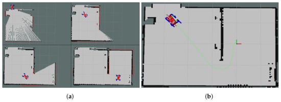 In preparation for organizing objects, the robot initiates its process by determining its position and comprehending its immediate environment. This initial phase involves the creation of a spatial map using ROS’s SLAM package known as gmapping.Through manual guidance within the designated area, the robot creates a map using LiDAR data and odometry, as illustrated in Figure 11a. As the locomotion algorithm used in this framework generates less staggering in gaiting, additional compensations are not required.