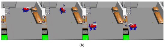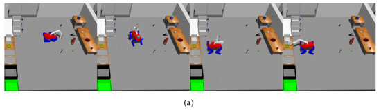 The experiment was repeated across five distinct environments, each involving ten objects from the selection shown in Figure 19. The outcomes of these trials are summarized in Table 4, providing details such as the number of successful attempts, the number of failures, the success rate, and the duration taken for each test. However, as the opening of the drawers succeeded in all experiments, it is not described in the table. Notably, the average success rate across all trials amounted to 96%. Moreover, the success rates for all environments consistently exceeded 80%, underscoring the system’s robust performance across varying contexts. Comparatively, our system exhibited longer task execution times in certain scenarios, such as turning in place, walking sideways, and setting a grasp-ready pose, when compared to a wheeled robot. In particular, our platform required more than 3 min to complete the tasks with six fewer objects than [10], which utilized a wheeled robot (HSR) for a similar experiment.