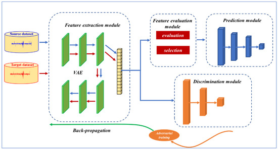 - Conditional mapping constraintswhere is the mapping function in source domain of the feature extraction module. is the label. The ⊙ symbol represents the dot product operation symbol, where and are the data samples from the source domain and the target domain, respectively; is the mapping function of the domain discrimination module; and is the mapping function of the feature extraction module.