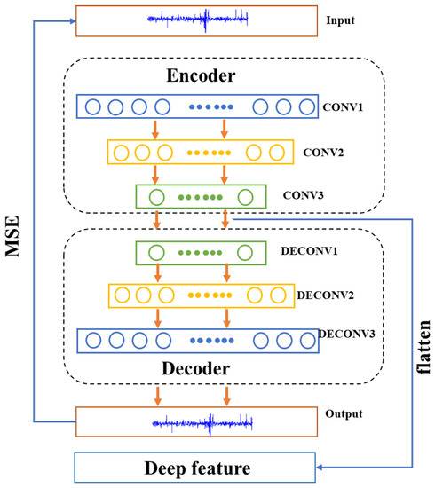 The feature extraction module adopts the unsupervised learning deep convolutional autoencoder network, and the network structure of the autoencoder is shown in Figure 2. The convolutional autoencoder network model is composed of a three-layer one-dimensional convolution layer and a three-layer one-dimensional deconvolution layer. The hidden layer features of the autoencoder network were pooled to provide features for the prediction and domain adaptation module. The parameters of the feature extraction module are shown in Table 1. The loss function of the network is the mean square error, and the specific formula is as given (1):
