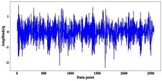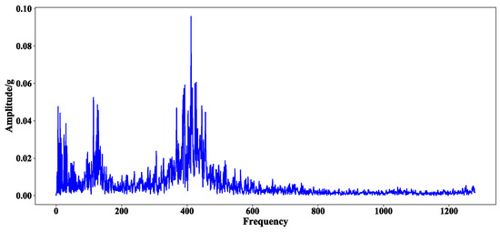 In the process of experimental verification, any bearing is selected from the bearing dataset 2 target domain data set as the test set, and the other six bearings are selected as the training set. Taking bearing2_3 2–3 as an example, the effectiveness of the method is illustrated. The original vibration and frequency domain signal of the first 0.1 s sample of bearing 2_3 are shown in Figure 5 and Figure 6, respectively.