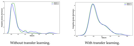 It can be seen from Figure 9 and Figure 10 that the probability density distribution of data extraction features in the source and target domain is quite different before transfer learning. After transfer learning, the consistency of probability density distribution of features was significantly improved, and the difference was reduced. This shows that the feature extracted by transfer learning is insensitive to the change of working conditions, which is conducive to the RUL-prediction model to achieve higher prediction accuracy.