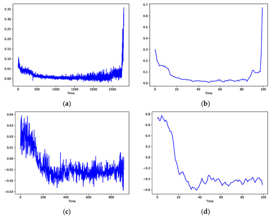 Trend items bearing 3_2 characteristics. (a) Trend term of bearing 1_1 feature. (b) Trend term of bearing 1_1 feature after down-sampling. (c) Trend term of bearing 2_1 feature. (d) Trend term of bearing 2_1 feature after down-sampling.