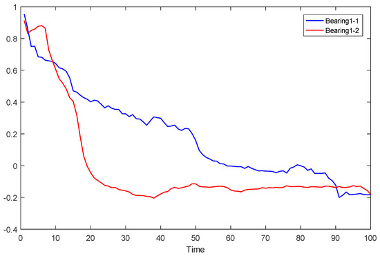 It can be seen from Figure 12 that the score of the 23rd feature sequence is the highest, while the score of the 22nd feature sequence is the lowest. To verify whether the score is reasonable, the trend items of the 22nd, and 23rd characteristic series of bearing 1_1 and 2_1 after down-sampling are listed, respectively, as shown in Figure 13 and Figure 14. By comparing Figure 13 and Figure 14, we can see that the more similar the trend is, the higher the index score is, while the more different the trend is, the lower the index score is. The above phenomenon shows that the calculation method of the trend consistency index is reasonable.