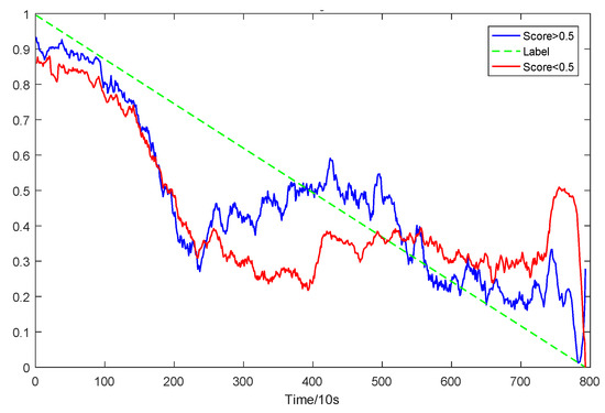 To explain the influence of feature scores on the prediction results, high-quality feature sets with scores above 0.5 and common feature sets with scores below 0.5 were used for training and prediction, respectively. Taking bearing 2_2 and 3_3 as test sets randomly, the prediction results corresponding to their high-quality and common feature sets are shown in Figure 16 and Figure 17, respectively.