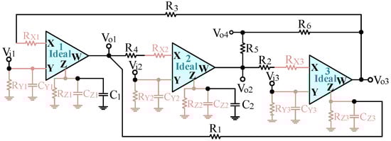 The CFOA terminal characteristics generally have various parasitic impedances [43]. The parasitic impedances of these non-ideal CFOAs can affect the performance of the proposed voltage-mode UAF. Figure 3 illustrates the non-ideal CFOA model for analyzing the parasitic impedances and their effect on the voltage-mode UAF configuration. Using the CFOA non-ideal model, the parasitic impedance effect of the proposed voltage-mode UAF is analyzed, as shown in Figure 4. Reanalyzing the voltage-mode UAF in Figure 4, the following non-ideal four output node voltages are obtained: