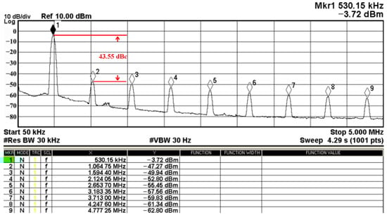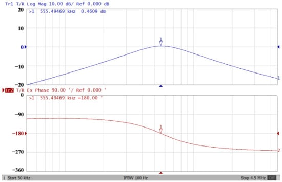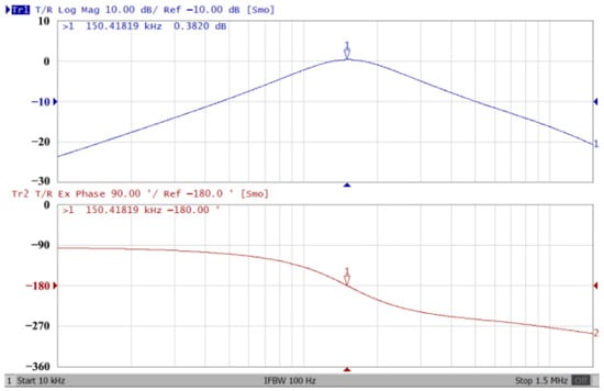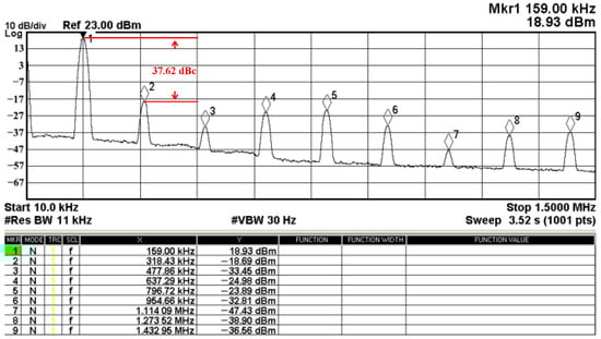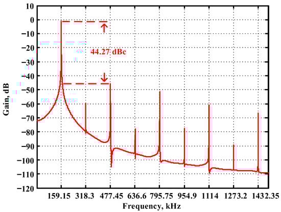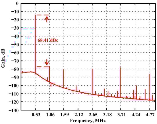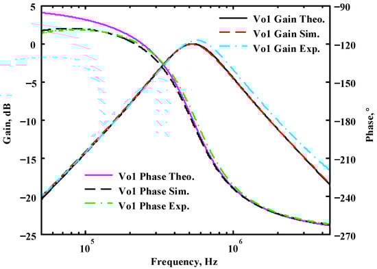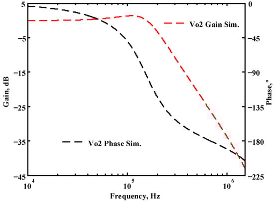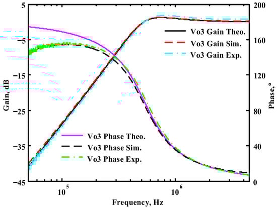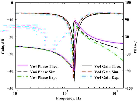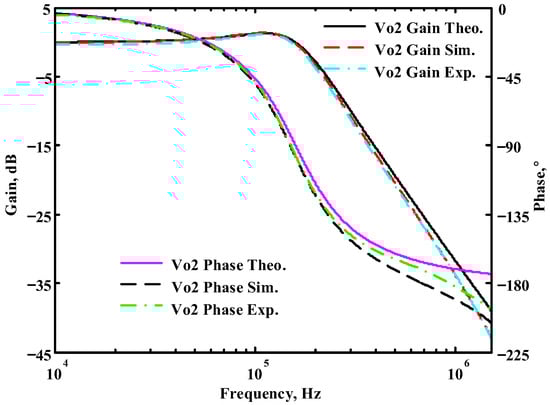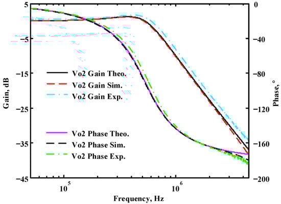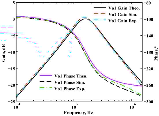The passive components of the AD844-based voltage-mode UAF are selected as C1 = C2 = 100 pF and Ri = 10 kΩ (i = 1 to 6) with a resonance frequency of fo = 159.15 kHz. Regarding the AD844 datasheet [44], the X terminal parasitic resistance of AD844 is RX = 50 Ω. The Z terminal parasitic resistance and parasitic capacitance of AD844 are RZ = 3 MΩ and CZ = 4.5 pF, respectively. According to (30), the effective operating frequency range of the AD844-based voltage-mode UAF is 1.74 kHz to 885.37 kHz. Figure 7 shows the simulated frequency spectrum of the IBP filtering response at Vo1. As shown in Figure 7, the total harmonic distortion (THD) is calculated as 0.6% for a sinusoidal input voltage of 2.4 Vpp. Figure 8 shows the measured frequency spectrum of the IBP filtering response at Vo1. As shown in Figure 8, the THD is calculated as 1.68% for a sinusoidal input voltage of 5.2 Vpp, and the measured spurious-free dynamic range is 37.62 dBc. The gain and phase of AD844-based VM-UAF in the frequency domain simulations are shown in Figure 9, Figure 10, Figure 11 and Figure 12. Figure 13, Figure 14, Figure 15 and Figure 16 also show the measurements for the AD844-based voltage-mode UAF. The experimental and simulation results of the AD844-based voltage-mode UAF relative to the theoretical analysis are shown in Figure 17, Figure 18, Figure 19 and Figure 20. It can be seen that the experimental and simulation results of the AD844-based voltage-mode UAF are close to the theoretical predictions.