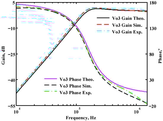 Ideal, simulated, and measured results for the AD844-based voltage-mode UAF at Vo3 NHP filter.