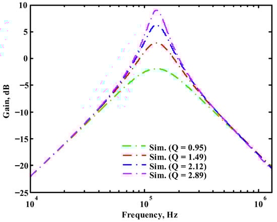 The simulated quality factor for the AD844-based voltage-mode UAF.