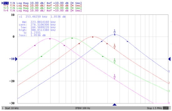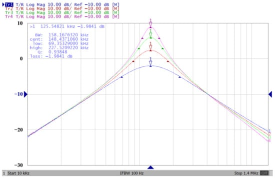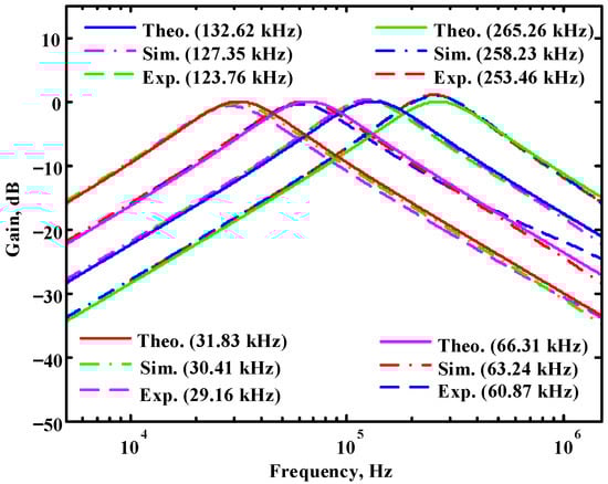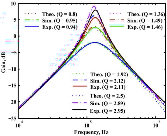 According to (14), R1 = R3 = Ra can independently control the Q value in the AD844-based voltage-mode UAF without affecting the parameter ωo. Thus, with fixed C1 = C2 = 300 pF and R2 = R4 = 4 kΩ, the required Ra values are 3.2 kΩ, 5.44 kΩ, 7.68 kΩ, and 10 kΩ for selected Q values of 0.8, 1.36, 1.92, and 2.5, respectively. Figure 21, Figure 22 and Figure 23 show the behavior of the AD844-based VM-UAF quality factor independently controlled by Ra when Vi3 = Vin and Vi1 = Vi2 = 0. According to (15), R3 = R4 = Rb can independently control the resonance frequency value in the AD844-based voltage-mode UAF without affecting the parameter Q. Thus, with fixed C1 = C2 = 100 pF and R1 = R2 = 10 kΩ, the required Rb values are 50 kΩ, 24 kΩ, 12 kΩ, and 6 kΩ for selected resonant frequency values of 31.83 kHz, 66.31 kHz, 132.62 kHz, and 265.26 kΩ, respectively. Figure 24, Figure 25 and Figure 26 show the behavior of the AD844-based voltage-mode UAF resonant frequency fo independently controlled by Rb when Vi3 = Vin and Vi1 = Vi2 = 0. As shown in Figure 23 and Figure 26, simulations and measurements confirm the theoretical analysis according to (14) and (15).