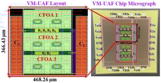 The overall layout of the CFOA-based voltage-mode UAF and its micrograph of a chip with two CFOA-based voltage-mode UAFs.