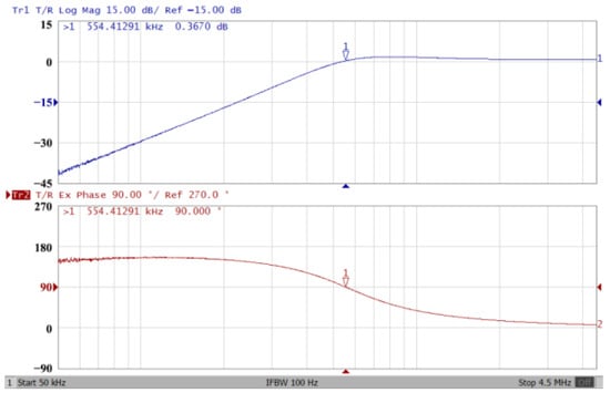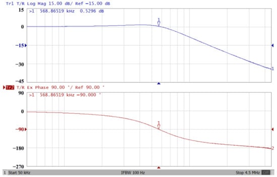 Gain (top) and phase (bottom) measurement results for the AD844-based voltage-mode UAF at Vo2 NLP filter.