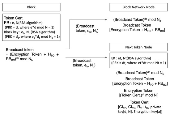 Figure 5 shows the formula process to broadcast a token encrypted by a block creation node to the block network. The token that has been created uses the public key (et, Nt) of the node set to receive the token to perform token encryption, as shown in Equation (6).