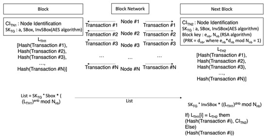 The first token node creates a transaction hash list (LTH), which is the result of executing a hash computation for the transaction collected. The transaction hash list that has been created is encrypted as the public key (PUTN) of the token node following in the next order and is encrypted as the token group matching key for broadcast to block the network. When the public key is (enb, Nnb) and the secret key is (dnb, Nnb), the node that will receive the transaction hash list Equation (13) broadcasts it to the block network to show the process of deciphering the token group at a certain node. Equation (14) shows token group encryption when the secret key of the token group is a and SBox for encryption, and the matching table for deciphering is InvSBox.