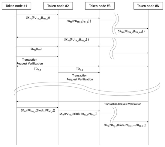Figure 8 shows the general consensus process of token nodes to perform transaction verification. A token node that has received a verified transaction hash list from all token nodes creates a transaction verification list (LTV), including the transaction list verified by all token nodes and the transaction’s hash verification list verified by more than half of the nodes. It is then encrypted with a token group matching key and broadcast to all networks. This is followed by a request for verification and its propagation to the incoming node. The token node that has been requested compares it with its own transaction list and sends it to all token groups when there are transactions with multiple verifications (TDV). Transactions not in the transaction list remove themselves from their own list and renew orders as per the list before propagating a request to perform verification at the node next in order. The first node requested for transaction verification by the Nth token node verifies its own block with the secret key in the authentication token and broadcasts to the node next in order. Token nodes that received blocks in consecutive order were then verified with their own secret keys. The Nth token node broadcasts to block network to block verification by all nodes when the number of verifiers is more than half of the entire token group.