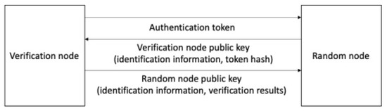 Figure 9 is the token verification process. Random node that acquired token information confirms node that created token via token creation server identification information and encrypts its own identification information authentication token’s token hash with its public key for propagation (broadcasting). By using its secret key, the verification node identifies the authentication request made by the encrypted random node and encrypts the identification information of the verification node and verification findings with a random node public key for broadcast to the block network. A random node uses tokens as per verification results and creates a token node group.