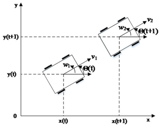 The mobile robot’s trajectory can be approximated as uniform linear motion during the two sampling intervals before and after, given that the sampling period Δt is typically small. Accordingly, the change in the mobile machine’s position and heading angle in the subsequent time intervals can be expressed as: