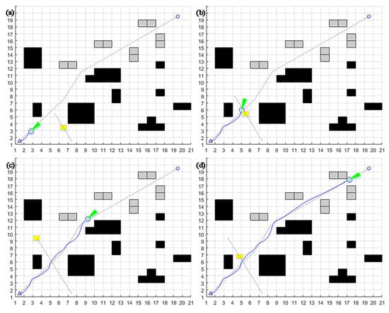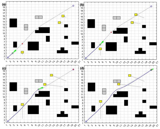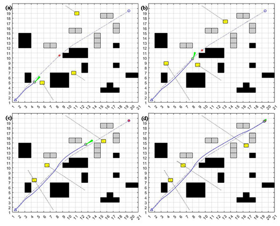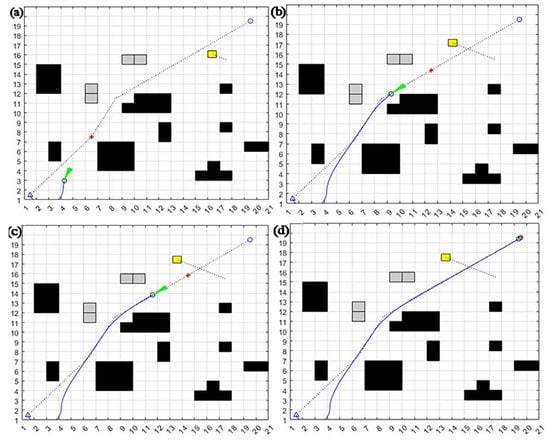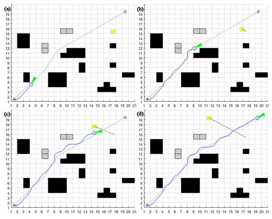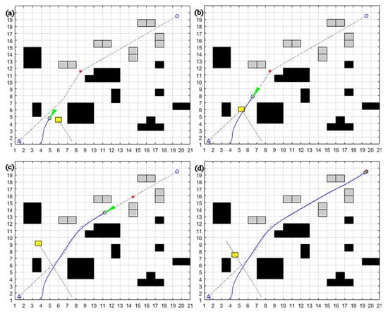 - When encountering “L”- or “C”-type obstacles positioned along the path between the mobile robot and the target point, it is easy to fall into the local optimum. When α = 0.8, β = 0.1, γ = 0.1, the target azimuth weight α is more extensive, and the mobile robot will head toward the target point. However, the mobile robot will be blocked by the trap-type obstacle on the line between the mobile robot and the target point. It may not be able to bypass the obstacle because the obstacle avoidance weight is too small, thus falling into the local optimum, as shown in Figure 2a.