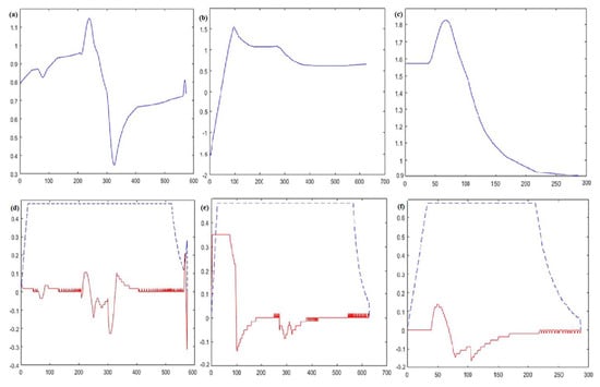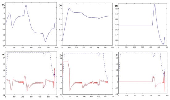 The attitude angle versus time curves are (a–c), and the linear and angular velocity versus time curves are (d–f). (a,d) DWA algorithm; (b,e) A* fusion DWA algorithm; (c,f) improved DWA algorithm. The solid blue line represents the orientation angle, the dashed blue line represents the linear velocity, and the solid red line represents the angular velocity.