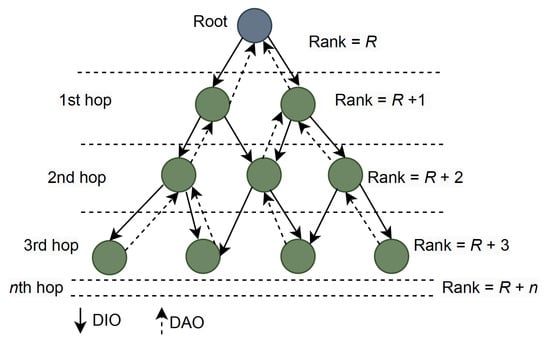 The network layer based on the RPL mechanism creates routing table entries with the help of three control messages, i.e., the DODAG advertisement object (DAO), DODAG information solicitation (DIS), and the DIO. These messages help to construct the DAG structure. DODAG construction begins with the initiation of the sink node, which broadcasts the DIO messages to propagate information about the network’s structure and configuration, including rank information. The rank information in DIO messages helps nodes assess their position in the network topology. Upon receiving the DIO message, the neighboring nodes measure their rank and broadcast the information to neighboring nodes. This process continues until all nodes within the DODAG have received the DIO message.