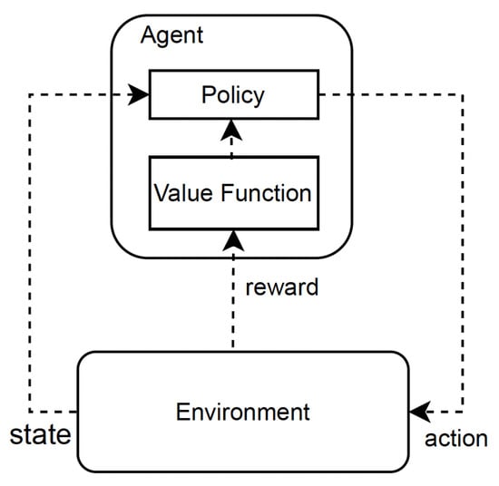 RL is a type of ML that focuses on learning the environment to maximize the cumulative reward []. RL can be broadly classified into two main approaches, i.e., model-based and model-free RL []. In a model-based approach, the agent considers the range of future possibilities to decide the possible action beforehand. AlphaZero is one of the notable examples of a model-based approach []. In a model-based approach, the agent’s model based solely on its experiences can create challenges such as bias, leading to subpar performance in a real environment. In addition, this approach is very computationally intensive, which can lead to failures. In contrast, model-free methods are not based on “models” and thus are easier to implement and tune, leading to a lower sample efficiency. Model-free approaches can be split into two types based on the learning they are designed to perform. The first is policy optimization and the second is Q-learning. Advantage actor–critic and asynchronous advantage actor–critic [], as well as proximal policy optimization [], are prime examples of this optimization method. In Q-learning, an optimal function is learned by approximating it using . Most optimization techniques either use policy optimization or the Q-learning method. However, some algorithms such as [] use both methods.