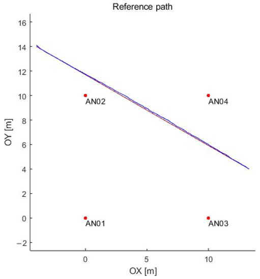 So, the most significant impact on the accuracy of the determined positions of the moving object is the time delay resulting from the ranging process between the tag placed on the moving object and the reference points. As the speed of the object increases and the acquisition time increases, the object’s displacement also increases—see Figure 1, according to Formula (1):