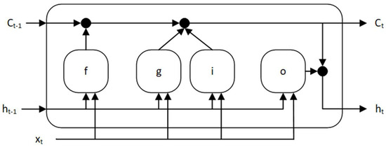 Input weights— W f ,   W g ,   W i ,   W o , recurrent weights— R f ,   R g ,     R i ,   R o , and biases— b f ,   b g ,   b i ,   b o , are learned (tuned) during the training process of the network.