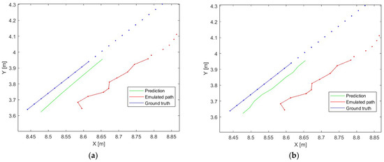 The estimation of the next position involves the use of data that could not describe similar cases but a whole set of different paths that should cover, to some extent, the possible situations (paths of movement) that may occur in the local frame of reference. It should be noted that in the proposed approach, successive displacements Δ P in the local coordinate system are used as the network’s input so that the network learns based on the displacement and not on absolute positions in the local frame of reference. So, the sequences (paths) are somewhat similar to each other (for a given speed and acceleration). This approach makes the system more universal and independent of the target coordinate system, which makes prediction possible on any section of the path along which the object is moving, regardless of its absolute position. It should also be mentioned that a finite number of straight lines can approximate an arc (bend).