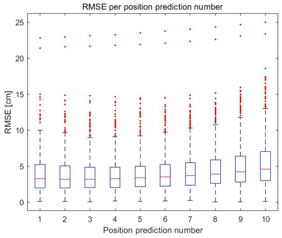 Prediction of the position of moving objects is, in other words, forecasting an event or feature value of a variable based on information from the past. Various methods are used to forecast the value of a variable, e.g., Kalman filter (KF), autoregressive integrated moving average (ARIMA) [43], or recurrent neural networks (e.g., LSTM) [44,45]. KF is widely used to estimate the position of an object. Its application involves the preparation of a mathematical model, which also allows for data fusion in multi-sensor systems. With the increase in data sources, the mathematical model becomes complex and often requires certain assumptions to simplify the model. Finding a direct relationship between the data is sometimes complicated or even impossible. The big challenge is to tune the noise covariance matrix, which tells how relevant the model is, i.e., what is the difference between the model and the actual motion of the object. ARIMA models are used for short-period prediction based on past data. This model is widely used for forecasting univariate problems—cannot capture dependencies between different data sources (variables). The vector autoregressive (VAR) is designed for multivariate problems—so it can consider multiple data sources and find the relation between them [46]. This model can be extended with exogenous variables (unmodeled inputs to the model) that are introduced to explain outcomes in the model (VARX—vector autoregression with exogenous series). The neural network-based approaches can find dependencies between a large number of variables without a complex mathematical model—so the way of data fusion is learned during training. The commonly used recurrent neural network for forecasting problems is LSTM. In the position prediction, the dynamic model can be unknown for LSTM in contrast to KF, where the model needs to be specified.
