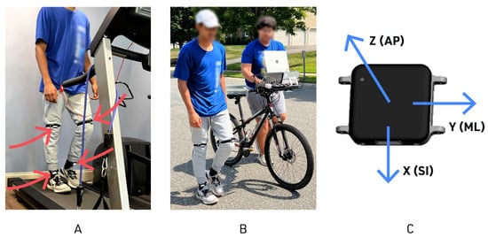 A sample participant wearing mounted IMUs while (A) treadmill walking and (B) outdoor walking (with customized holder for wireless data collection laptop); (C) axis orientation for the inertial measurement units (IMUs): Blue arrows indicate the following plains: Z axis = AP—anterior-posterior, Y axis = ML—medial-lateral, X axis = SI—superior-inferior (Source: APDM Wearable Technologies (v1.0, Portland, OR, USA)).