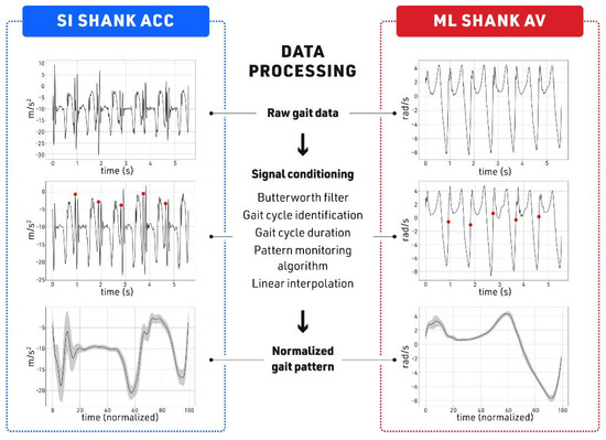 Signal conditioning and data processing. Acceleration in meters per second square (m/s2), angular velocity in radian per second (rad/s). Red dots indicate the start of each gait cycle.