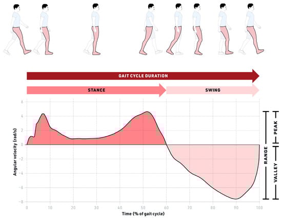 Spatiotemporal parameters (STP) measures were either signal-specific or gait-specific (see Figure 7). This parameter-based testing includes representative points or features of the curve. For each kinematic signal, the signal-specific parameters of peak height (maxima), valley depth (minima), and range (peak-to-valley distance) were extracted for each kinematic signal and then averaged over their respective trial. Note that the selected parameters, i.e., the extremums, of the kinematic signals used in our analysis are shown to be associated with the start and end of the swing/stance phase of gait (heal-strike and toe-off gait events) [10,47,48,49]. For comparison, we used the same features for all of the signals [47,48,49]. Because gait cycle duration and swing/stance time ratio (S/S) are non-signal-specific, they can be derived from one representative signal alone. These gait-specific parameters were derived using ML shank AV. The mediolateral angular velocity of lower limbs, especially that of the shank, is used in various studies for gait segmentation and event detection [50], specifically for measuring gait cycle duration [10,45] and S/S [23,51]. During ambulation, locomotion occurs via rotation around lower limb joints, i.e., around the medial–lateral axis. Thus, angular velocity contains prominent information about participants’ gait and is a reliable kinematic signal for gait analysis. Accordingly, via visual inspection of our dataset, we confirmed the ML shank AV signal as having a relatively low noise ratio across the sensors tested.