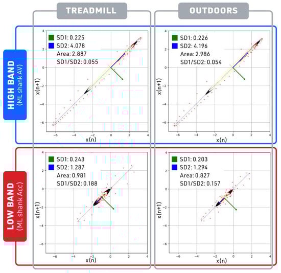 Poincare analysis of self-selected speed. Plot to visualize a High-band signal (Mediolateral shank angular velocity, shown in blue box) and a Low-band signal (mediolateral shank acceleration, shown in red box) from the treadmill and outdoor datasets.